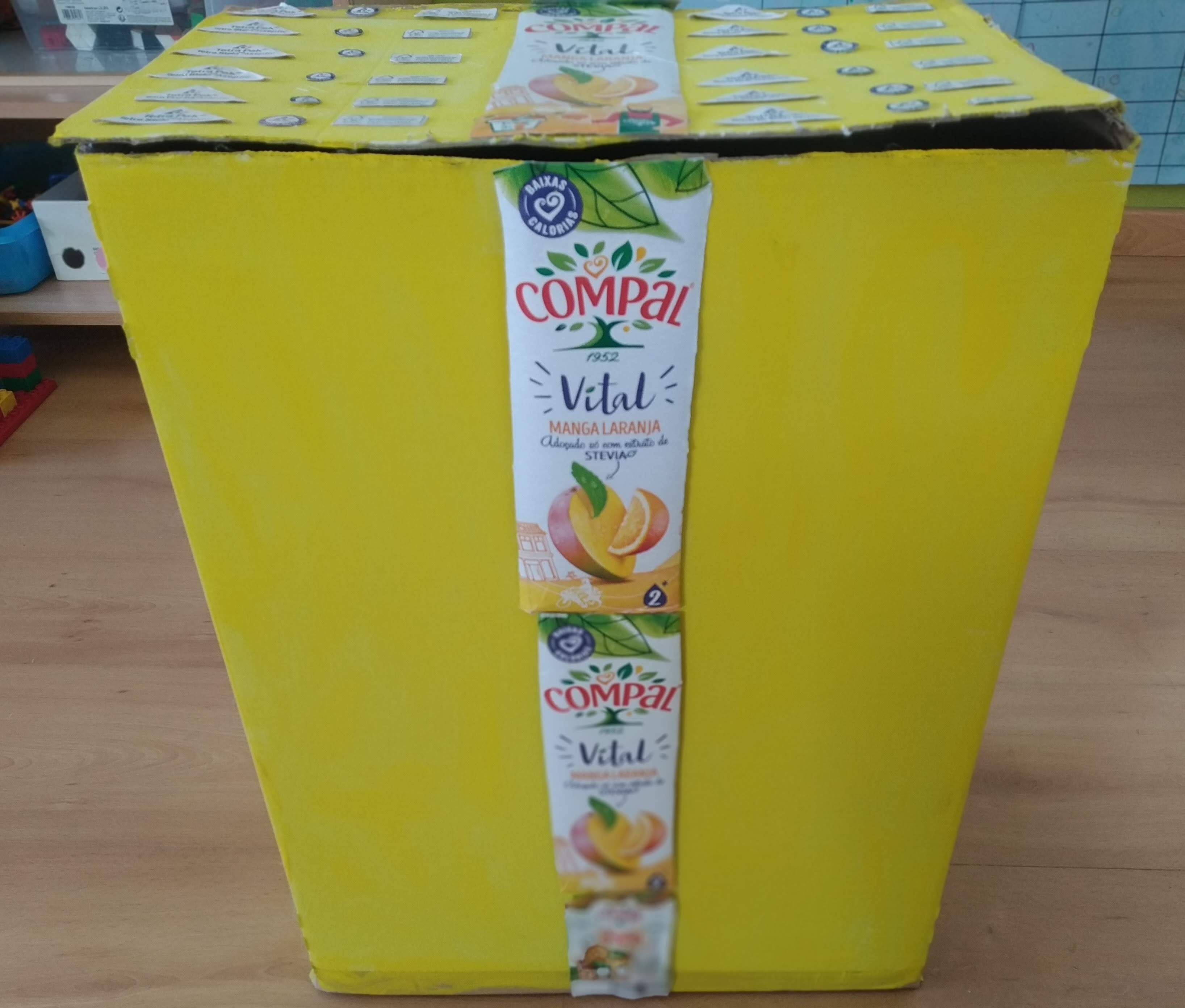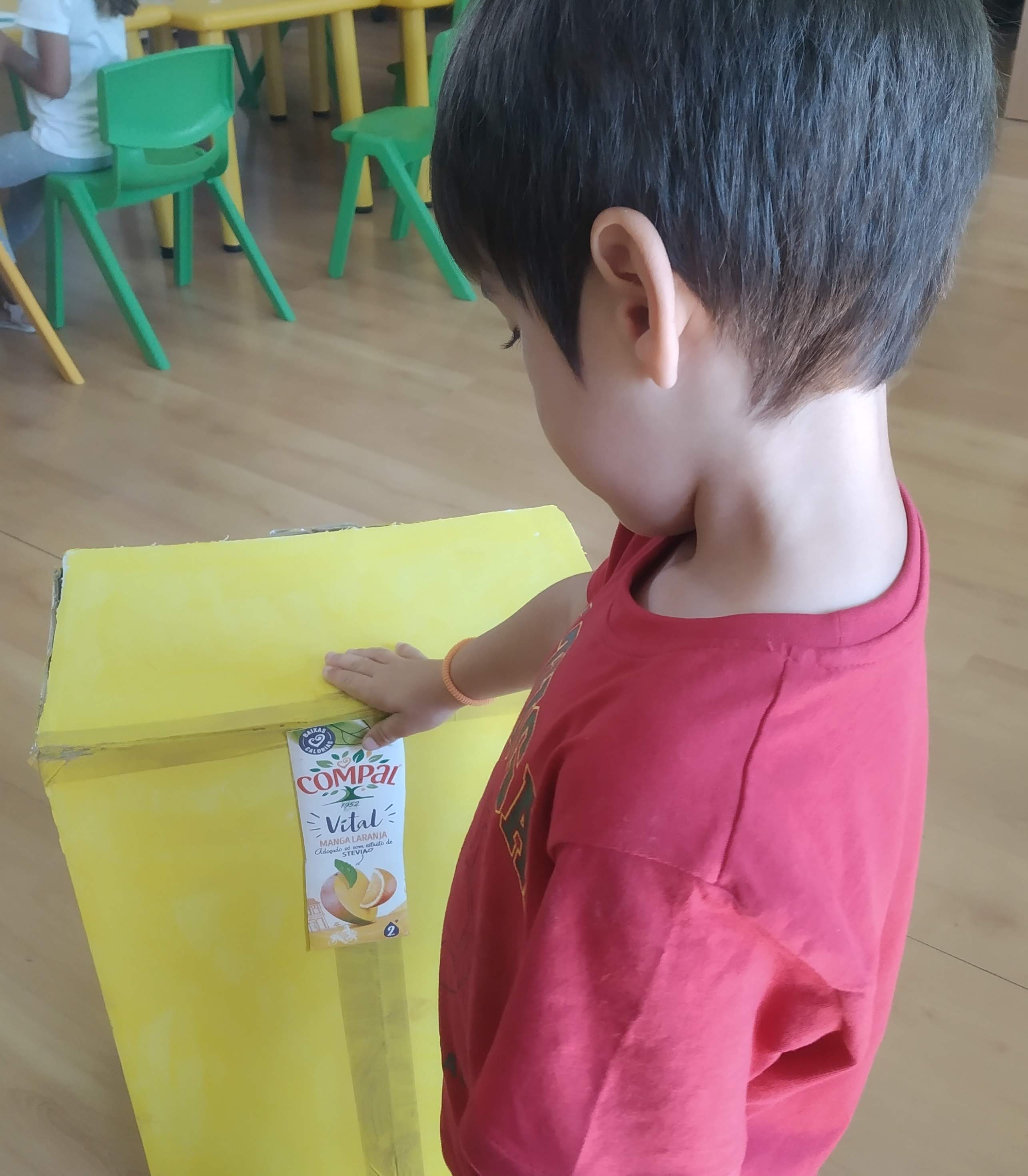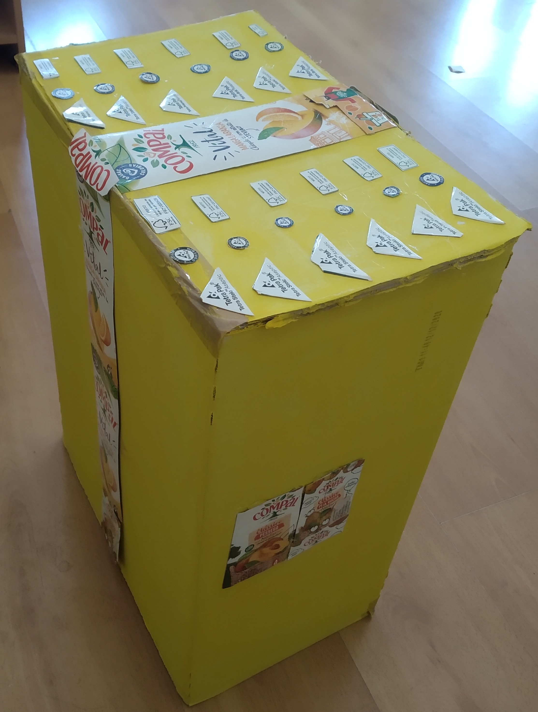 Começamos por escolher uma caixa de papelão. Pintámos de amarelo, recortámos as embalagens da Compal e tetra pack . Com os símbolos recortados, uma criança disse que o símbolo da Tetra pack fazia lembrar triângulos, outros círculos e o símbolo FSC retângulos. Então colaram os símbolos e fizeram um padrão. Colocamos o ecoponto à porta da sala, visto que já temos um no espaço exterior.