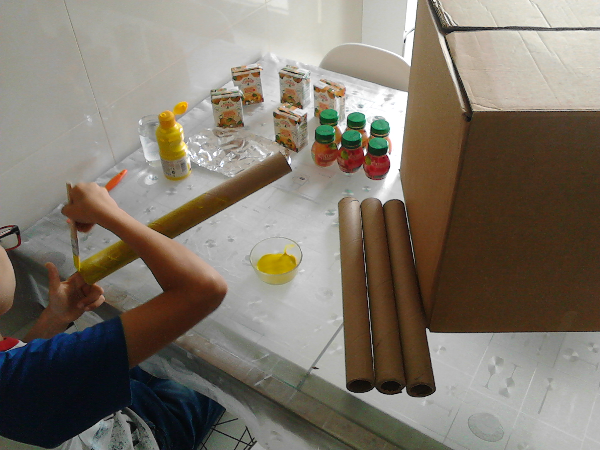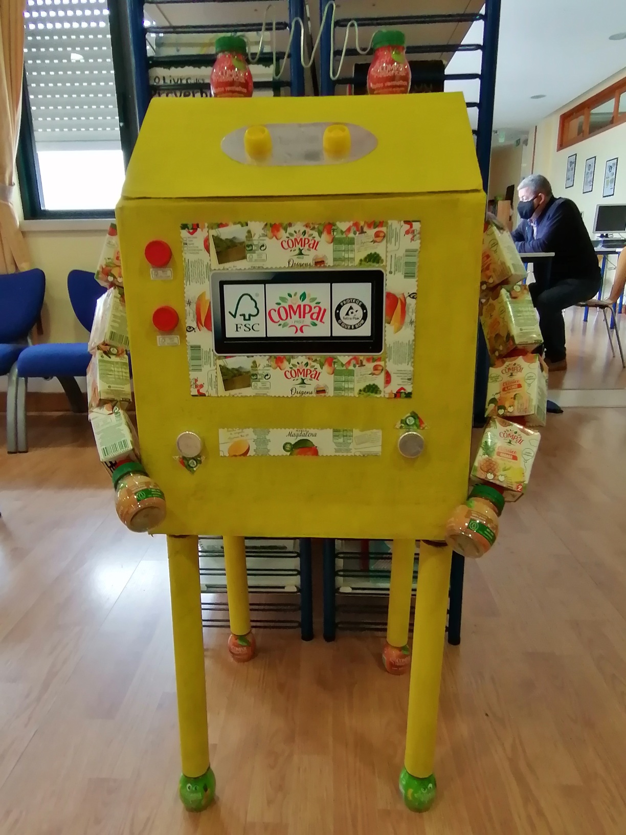 A construção do Ecoponto Amarelo “Robot Reciclador”, iniciou com a recolha de materiais disponíveis em casa e para além das embalagens da Compal, foram ainda utilizados os seguintes materiais: caixa de cartão, tubos de cartão, arame, tintas, pinceis, tesoura. Foi elaborado o desenho do projeto e de seguida pintada a caixa de cartão para o corpo e os quatro tubos que seriam as pernas do robot. Procedeu-se à colagem dos pés (embalagens de Compal Essencial) nos tubos de cartão pintados (pernas). Elaborou-se os braços do robot (corte e dobragem do arame, colocação das embalagens Tetra Pak alternadas com bocados de tubo vermelho e colocação da embalagem de Compal Essencial na ponta -mão do robot) e montagem dos braços e pernas no robot. Decorou-se o robot (colagem de tampinhas a fazer de botões de comando, símbolo da reciclagem, ecrã com os símbolos Compal, FSC, Tetra Pak). Decoração da cabeça do robot (colagem de papel de alumínio com uma forma oval e colagem de duas tampinhas para fazer os olhos do robot). Para finalizar, elaboraram-se as antenas do robot (dobragem do arame, execução de furos em duas embalagens de Compal Essencial, colocação do arame nas duas embalagens Compal e colagem das mesmas no topo (cabeça) do robot).