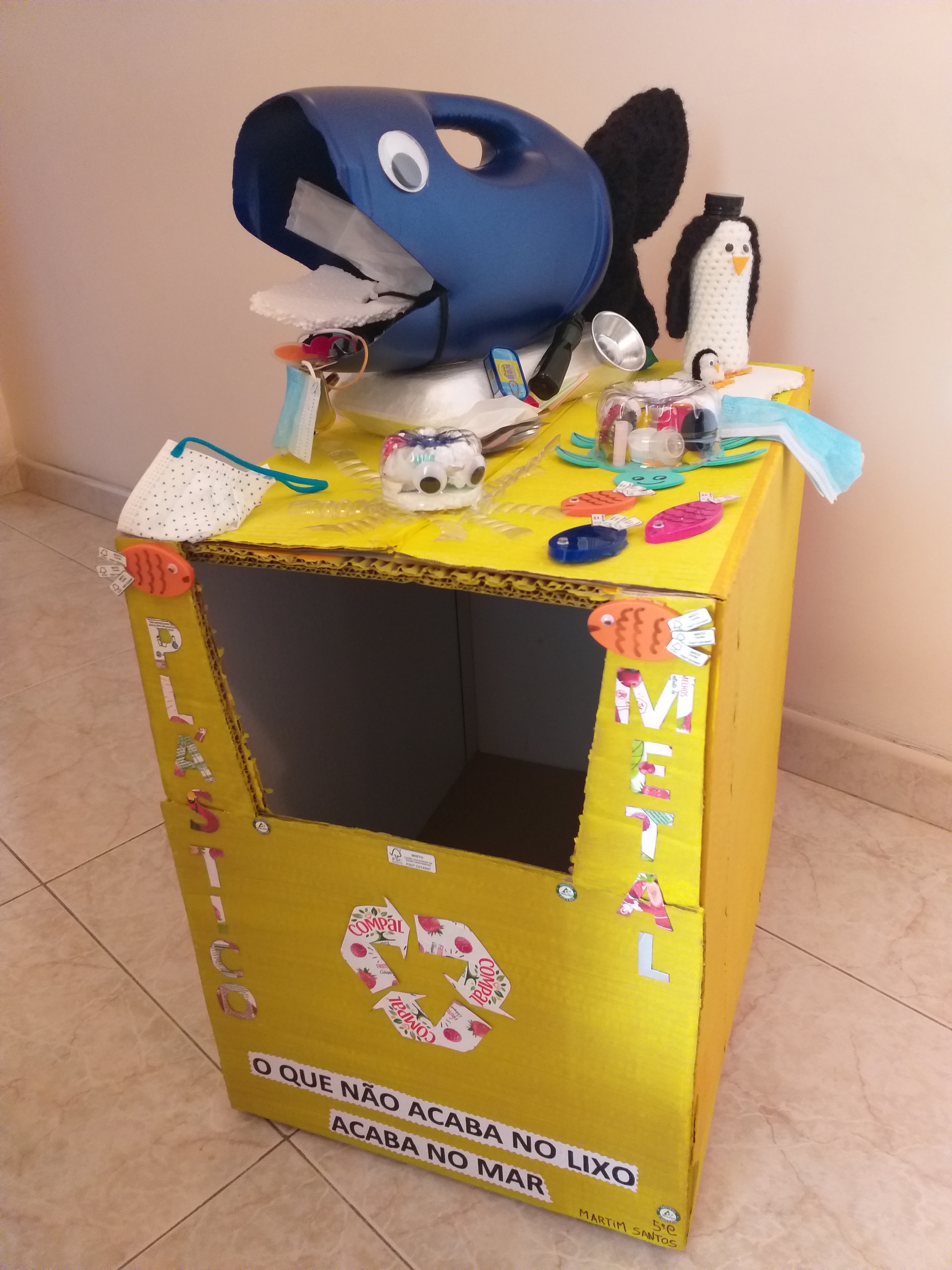 O ecoponto “O que não acaba no lixo, acaba no mar” foi realizado por um aluno do 5º ano, com a colaboração da respetiva encarregada de educação.