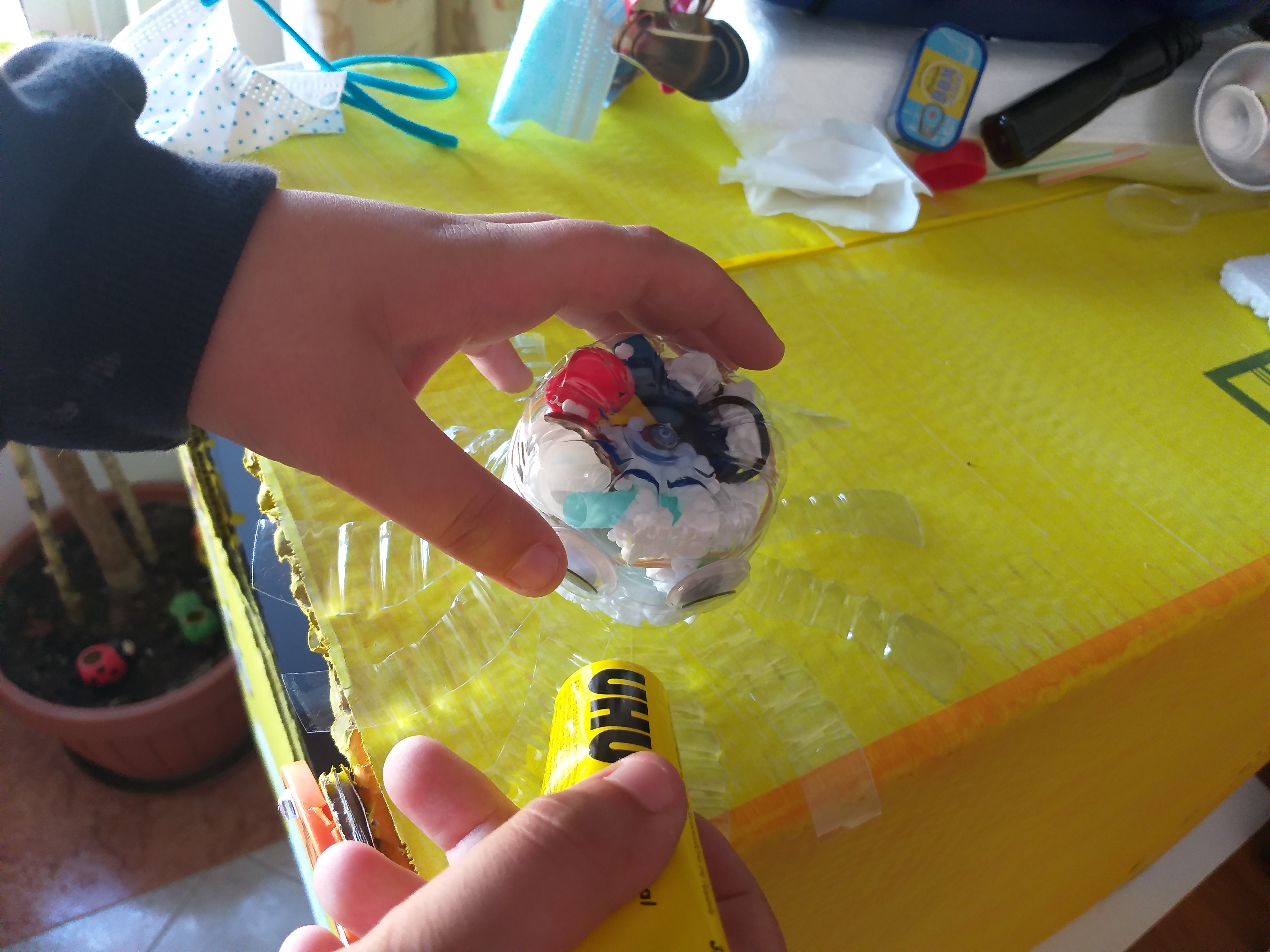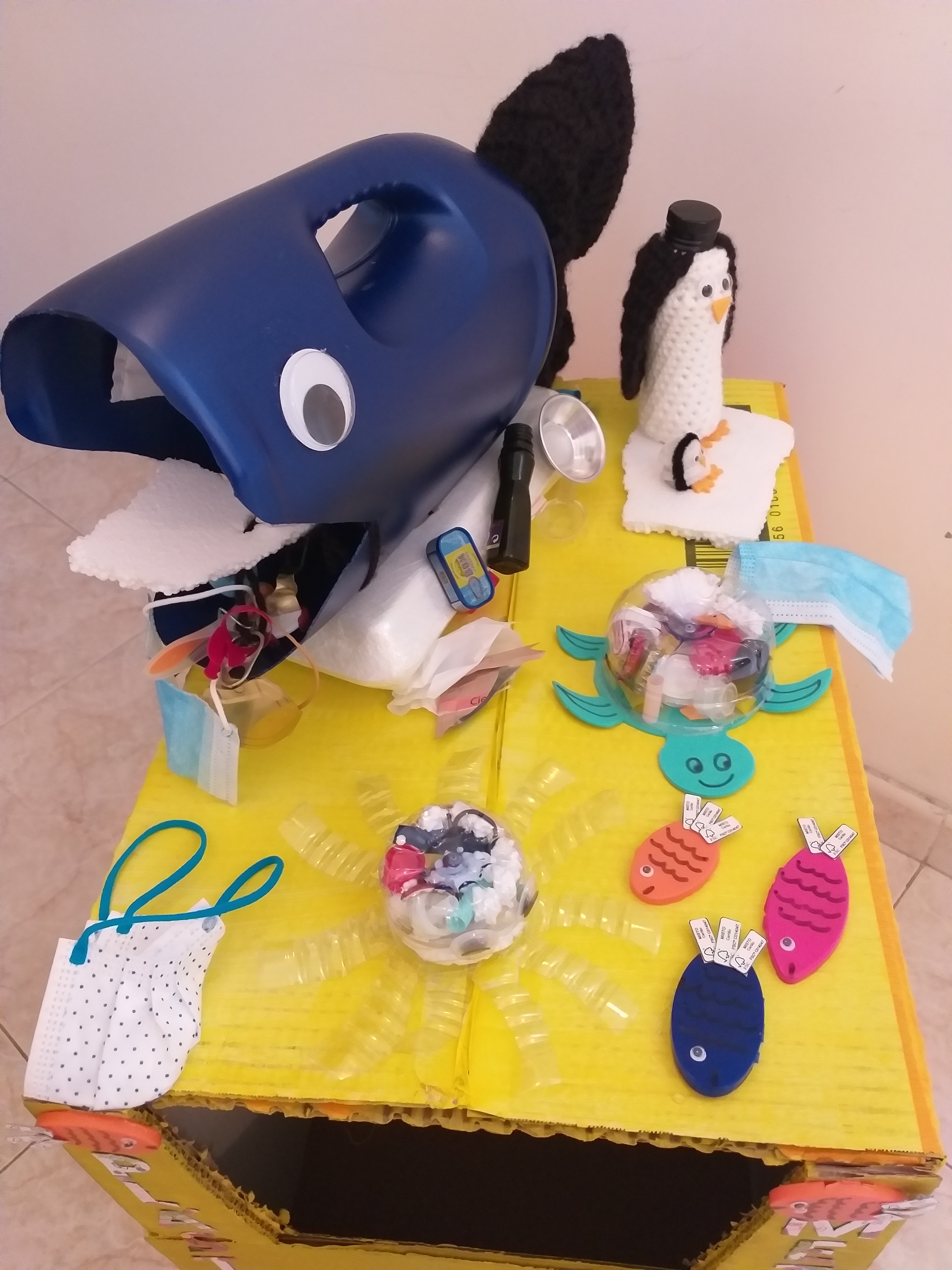 Tudo começou com a recuperação num supermercado de uma caixa de cartão com 50 cm de altura, que servia inicialmente de embalagem para guardanapos. Após pintar a caixa, procedeu-se à construção de todos os elementos decorativos do ecoponto, nomeadamente de animais como as baleias, os pinguins, as tartarugas, os peixes ou ainda os polvos, que sofrem com a separação incorreta do lixo pelo ser humano. Para tal, foram reutilizados diversos materiais, tais como uma grande variedade de embalagens da Compal (sumos, latas de leguminosas, entre outras), garrafas de água, embalagens de detergentes, tampinhas e caricas, palhinhas, limpa cachimbos, restos de lã, olhos de plástico e papel eva, para além de canetas de feltro, tintas, pincéis, agulha para crochê e cola.