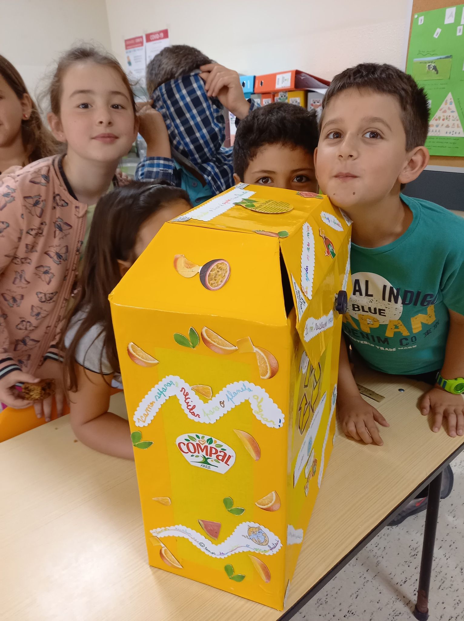 Foram utilizados vários materiais reciclados: uma caixa de cartão, embalagens Tetra Pack e Compal vazias com o selo FSC, tampinha das embalagens Compal como pega e ainda, cola, tinta, cordel, papel autocolante para reforçar e poder ser utilizado na escola…