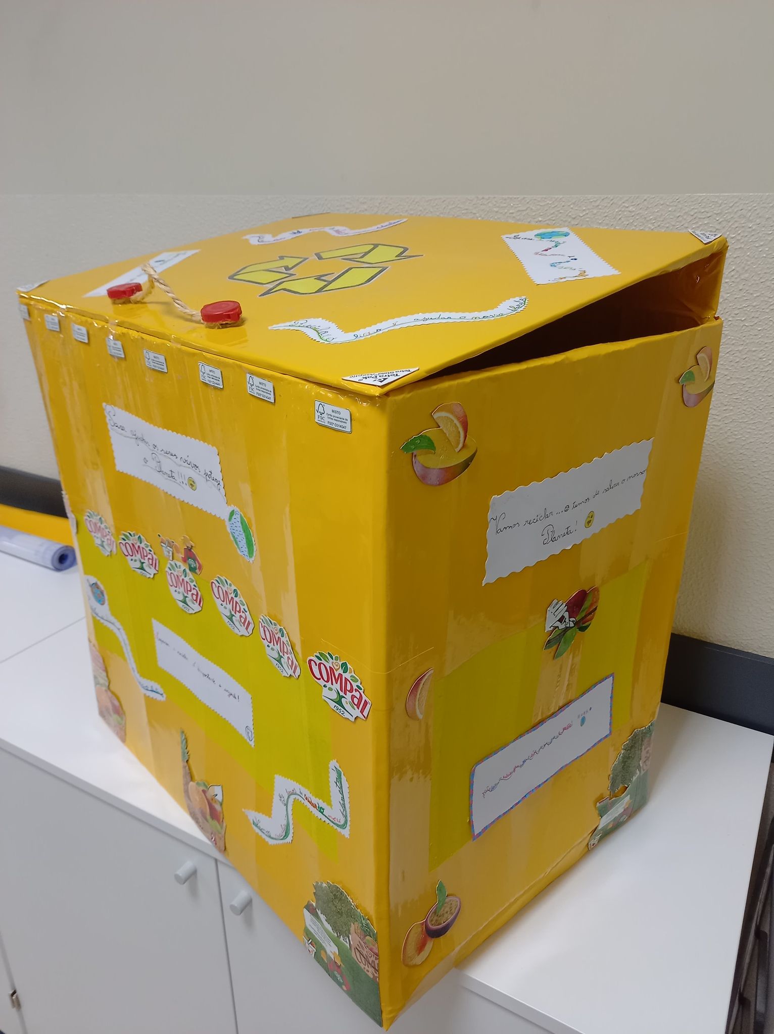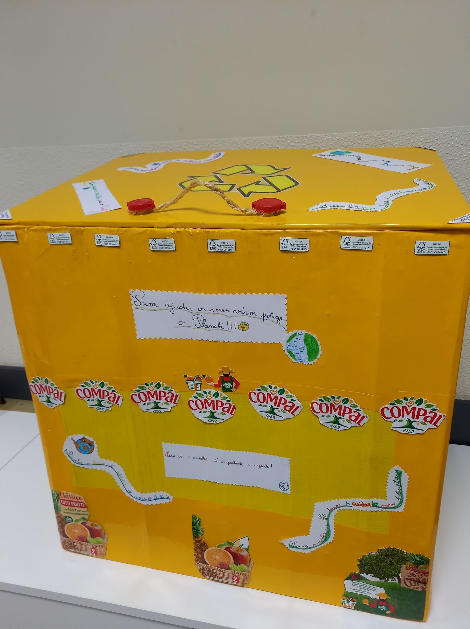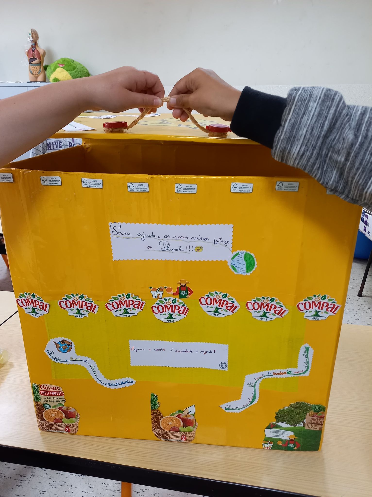 Foram utilizados vários materiais reciclados: uma caixa de cartão, embalagens Tetra Pack e Compal vazias, tampinhas das embalagens Compal para fazer a pega e ainda, cola, tinta, cordel, papel autocolante para reforçar e ser utilizado na escola…