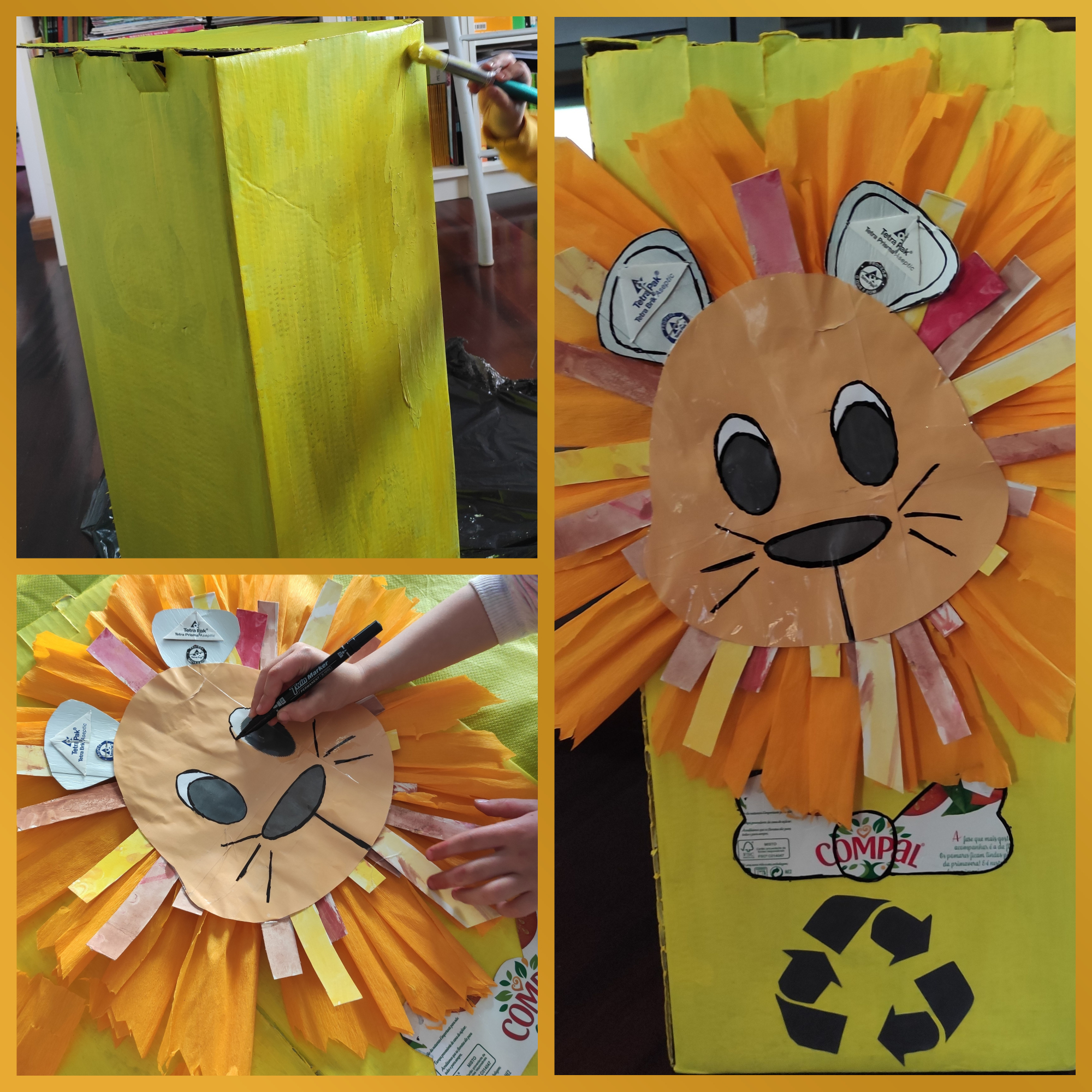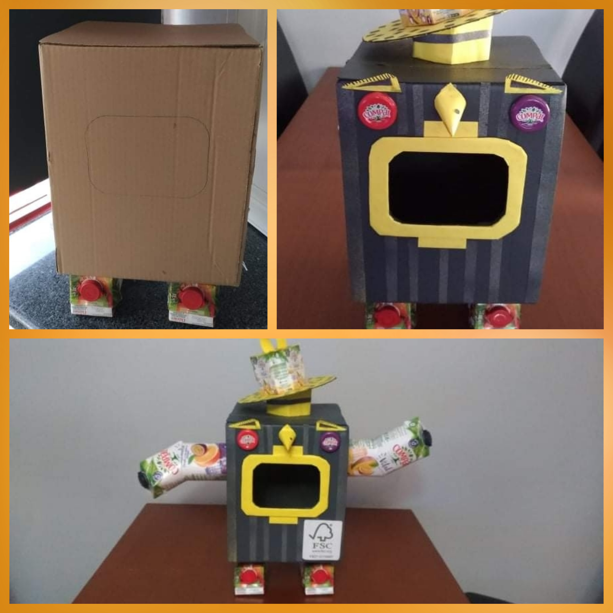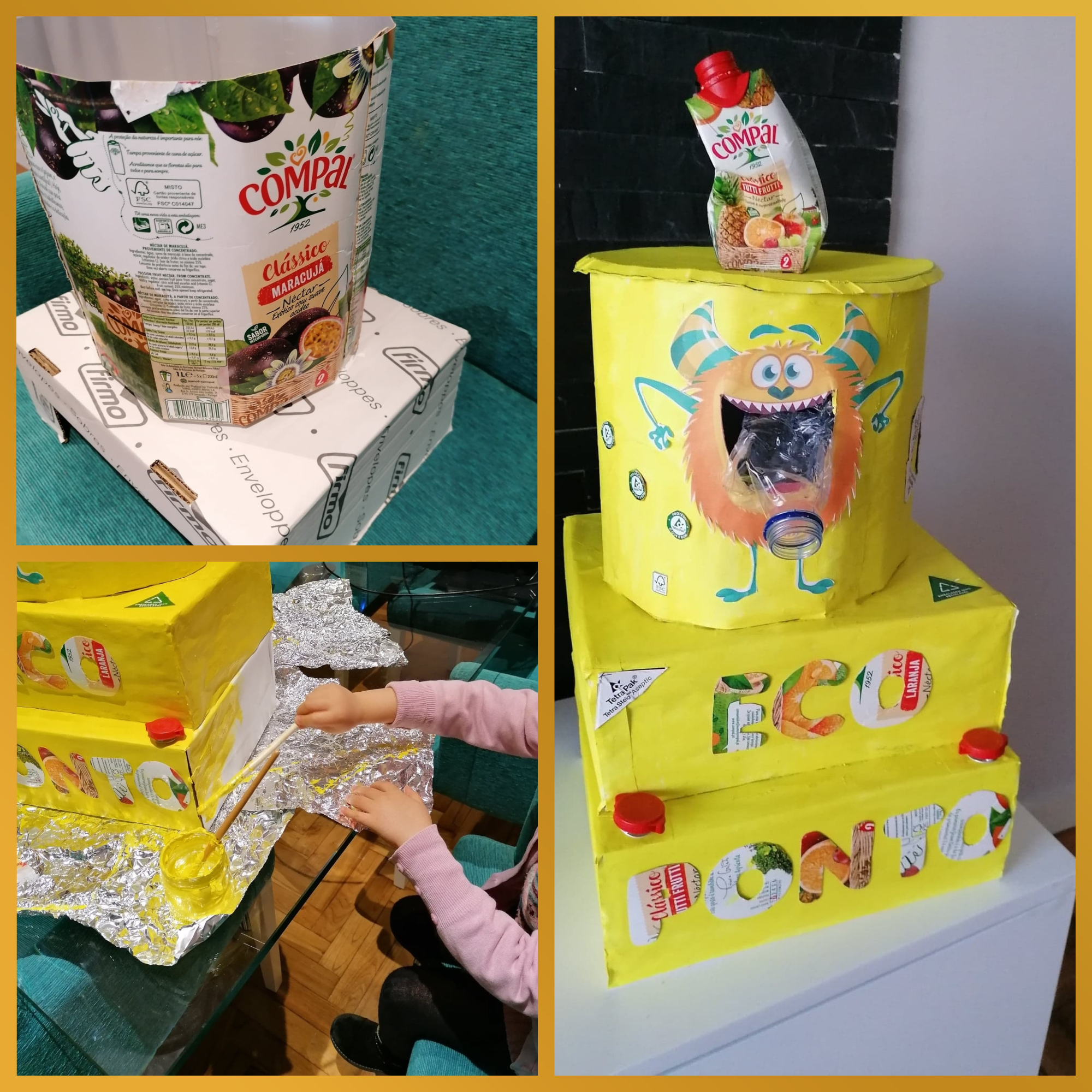 Pacotes de Sumo Compal , Cola, Tampas, Cartão de embalagens recicladas, pacotes de leite, tintas.