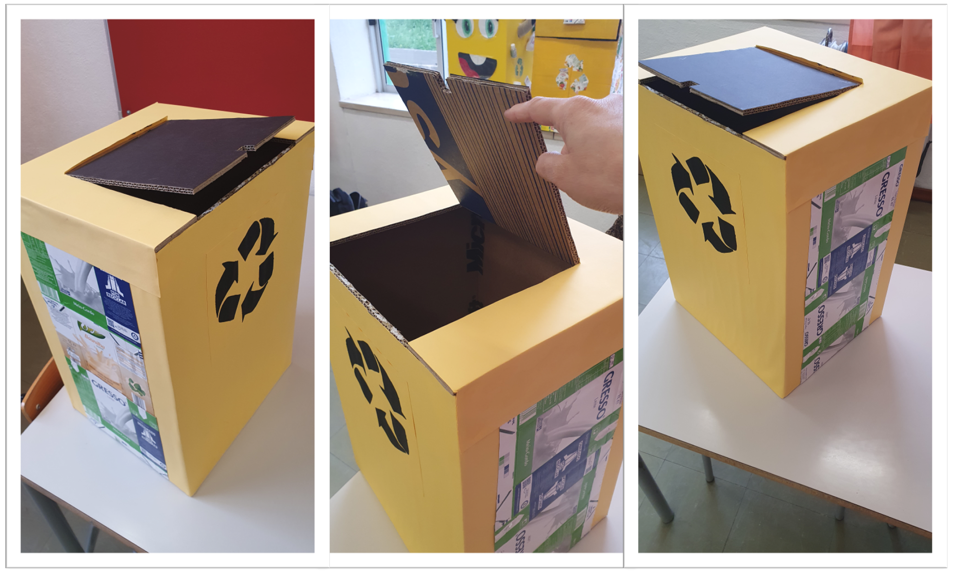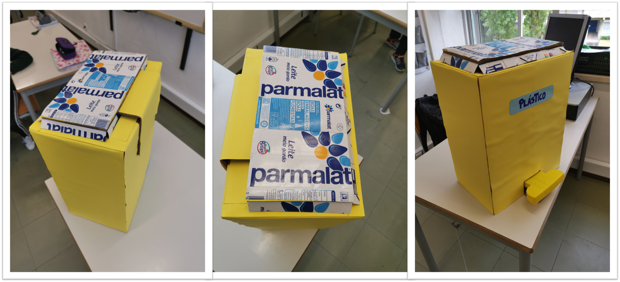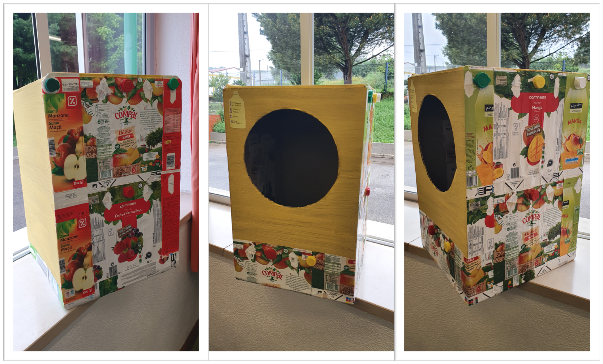 Fizeram a estrutura com os respectivos orifícios para a entrada de residuos e em seguida pintaram os ecopontos. Após a secagem da pintura, colaram as embalagens tetra pack e outros elementos que acharam interessantes para a decoração.