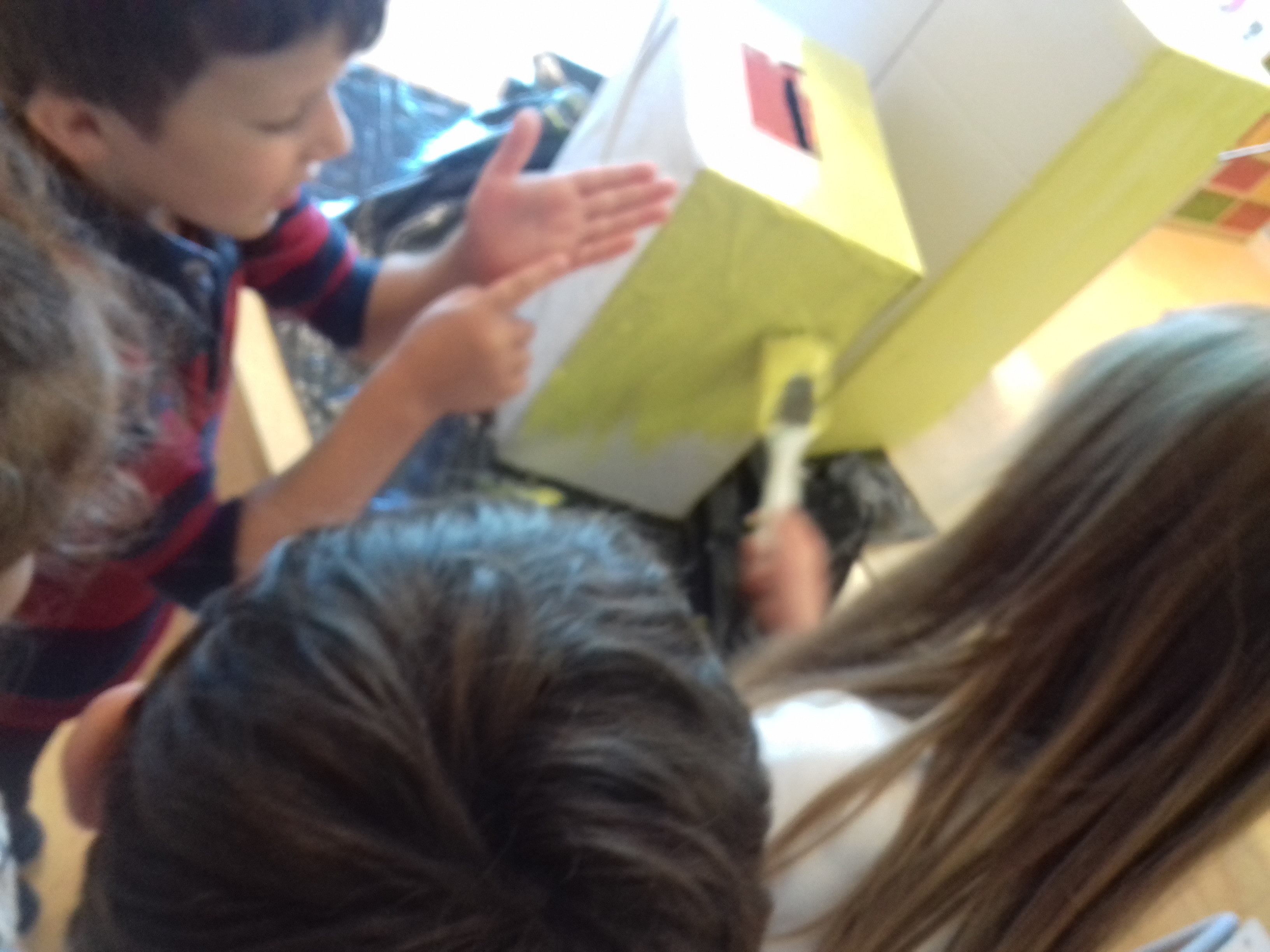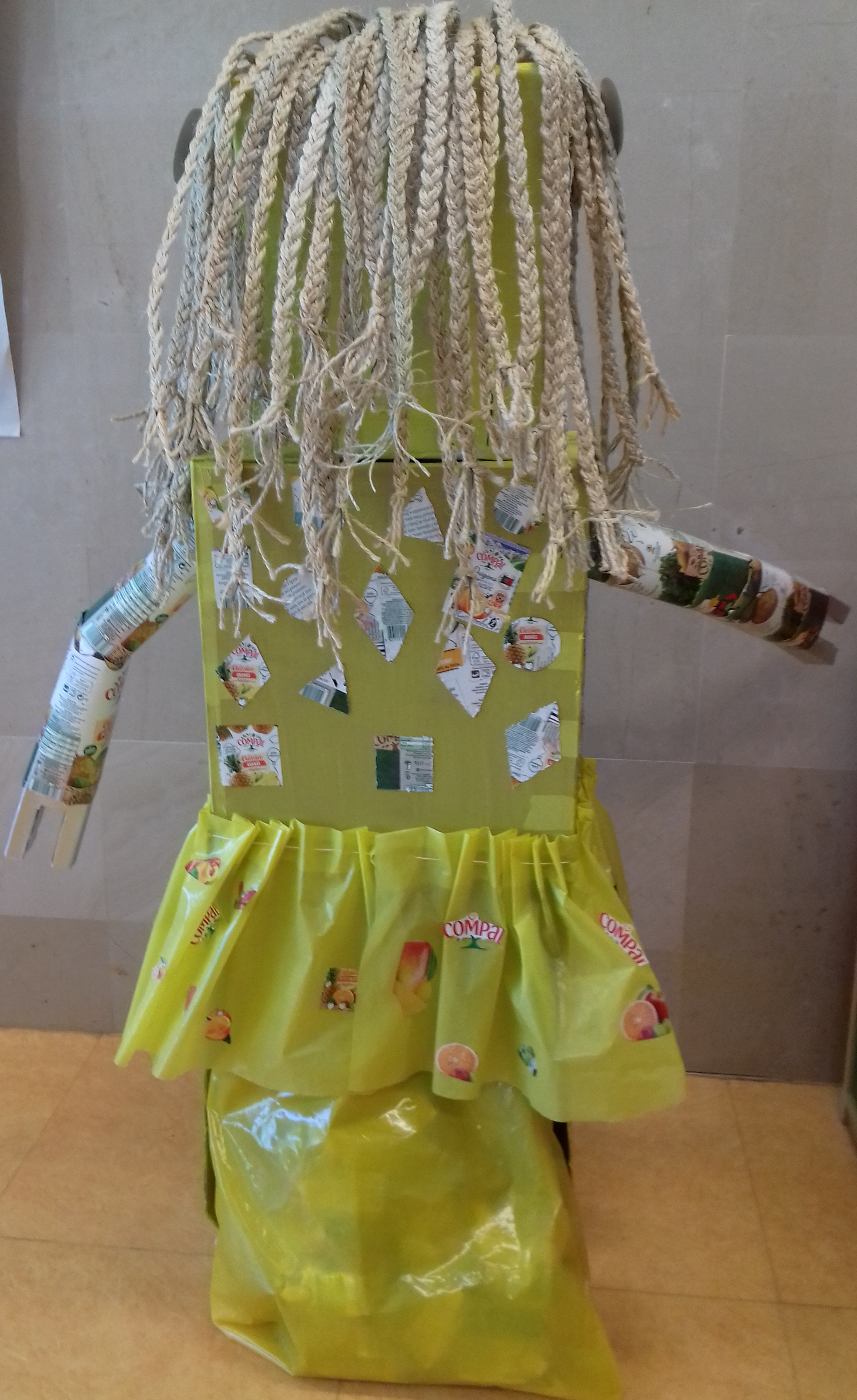 As crianças pintaram as caixas de cartão de cor amarela, participaram na elaboração das tranças, no recorte das figuras geométricas para colar nas costas e em todas as colagens, nomeadamente dos símbolos da tetra pak nas “sobrancelhas” e das embalagens, para poderem identificar o lixo a colocar no Ecoponto amarelo. No diálogo de avaliação do resultado final foram registadas as frases mais significativas: