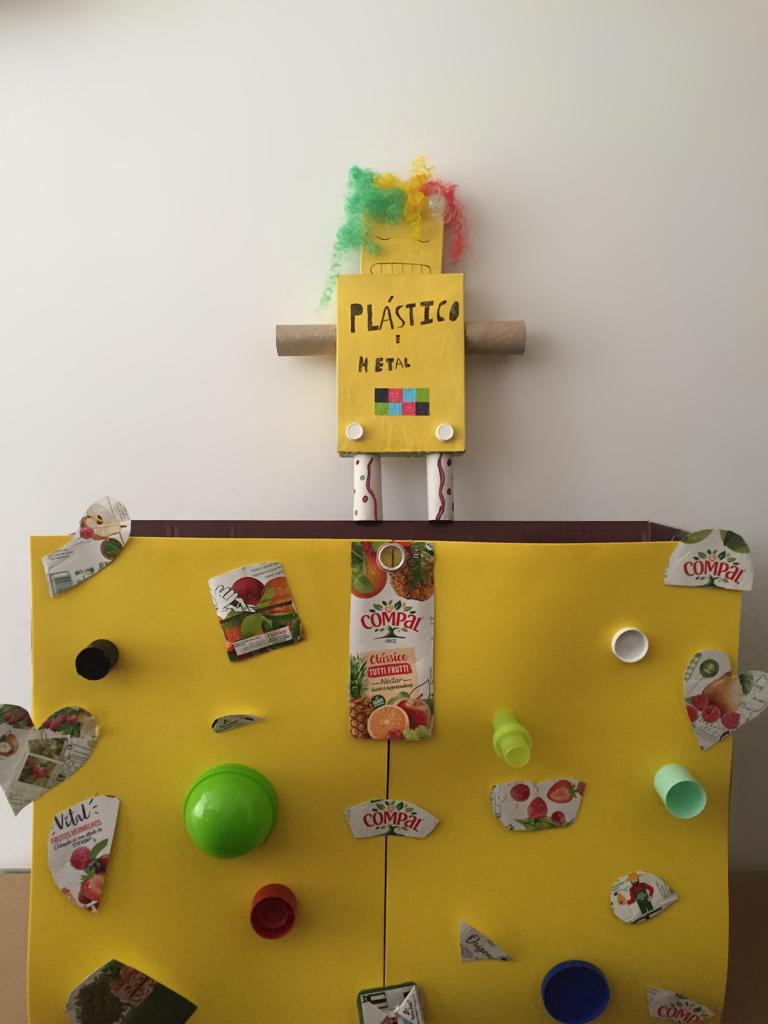 A aluna Beatriz Dias, do 7.º C da Escola Básica Bernardino Machado, participou no desafio “Constrói o teu ecoponto amarelo e recicla” no âmbito do programa Eco-Escolas. A aluna pertencente ao Conselho Eco-Escolas, elaborou um trabalho da sua autoria. A execução do trabalho foi realizada durante o período de confinamento 2021, sob a orientação da professora Ângela Magalhães, na disciplina de Educação Tecnológica. Para o efeito foi utilizada várias caixas de cartão (1 caixa de uma cadeira, 1 caixa de cereais e 1 caixa de gelatina), muitas tampinhas de plástico, papel Eva, embalagens Tetra Pak da marca Compal, papel, rolos de papel higiénico, fios de cabelo de uma peruca de Carnaval, tinta amarela, caneta de feltro preta, marcadores, cola e tesoura.