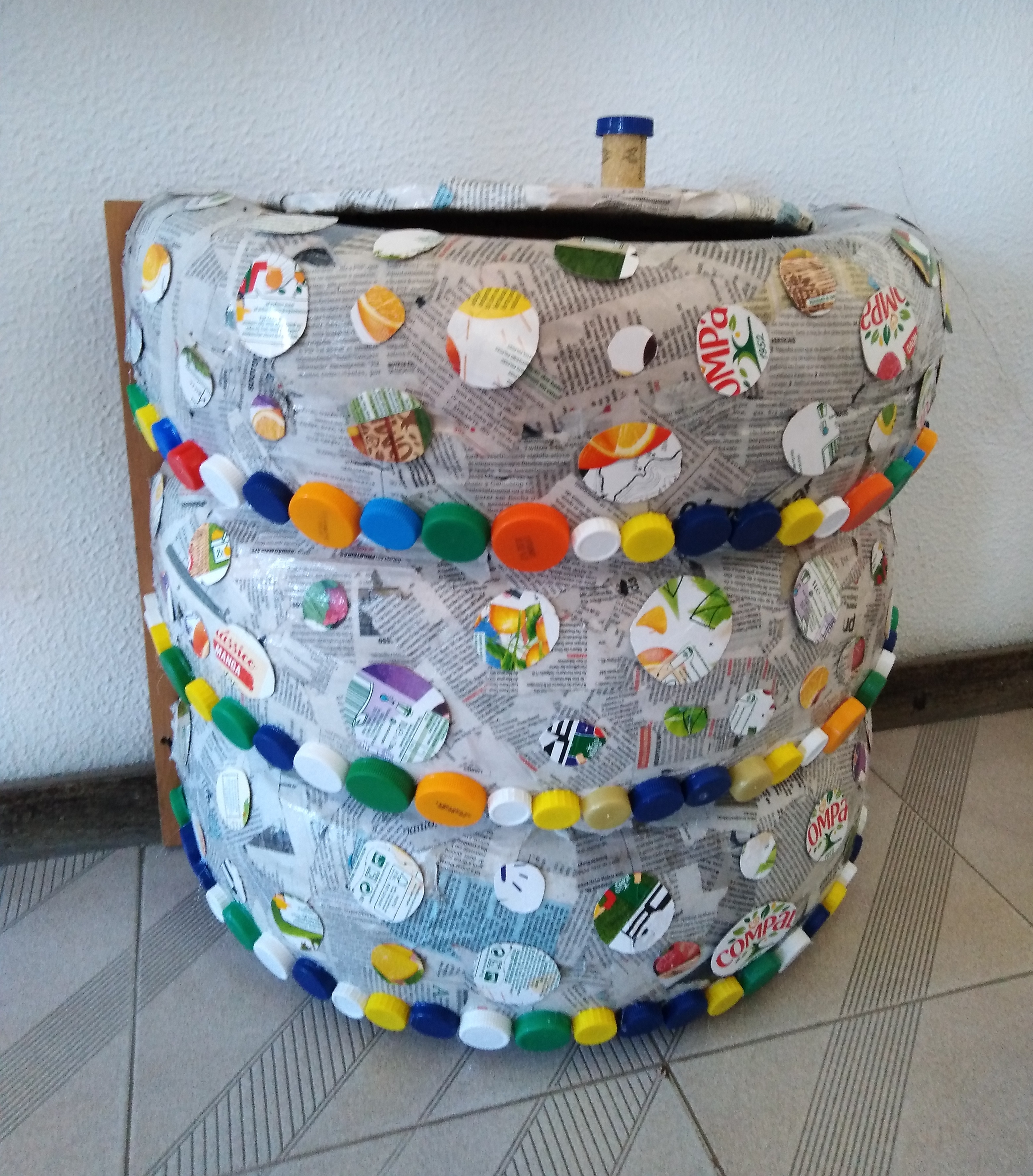 Materiais utilizados – embalagens de sumo Compal/Tetra Pak pequenas e grandes, cartão grosso, rolhas de cortiça, papel de jornal, cola, giz, tampinhas de várias cores, tesouras e colas UHU e de madeira.