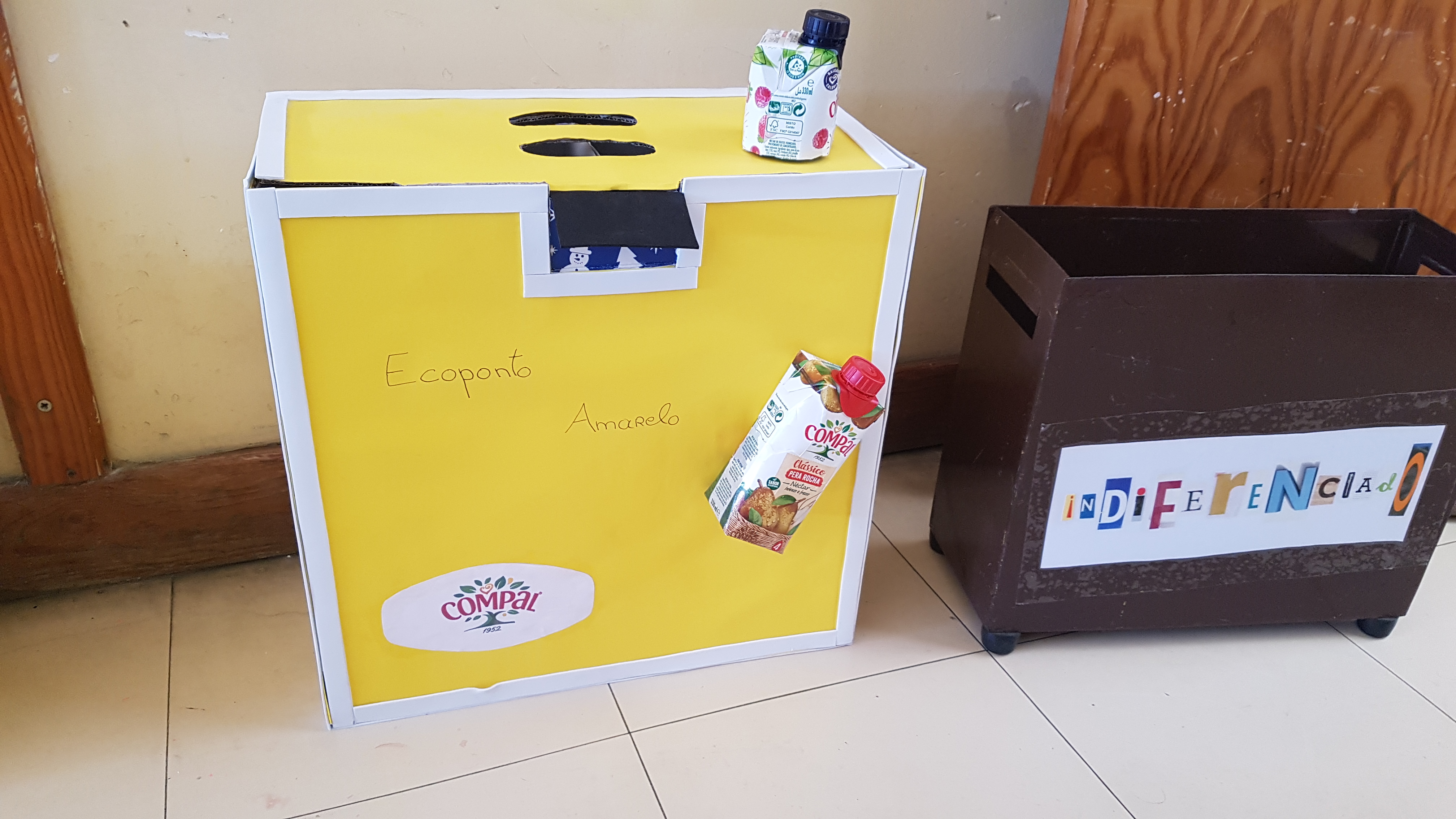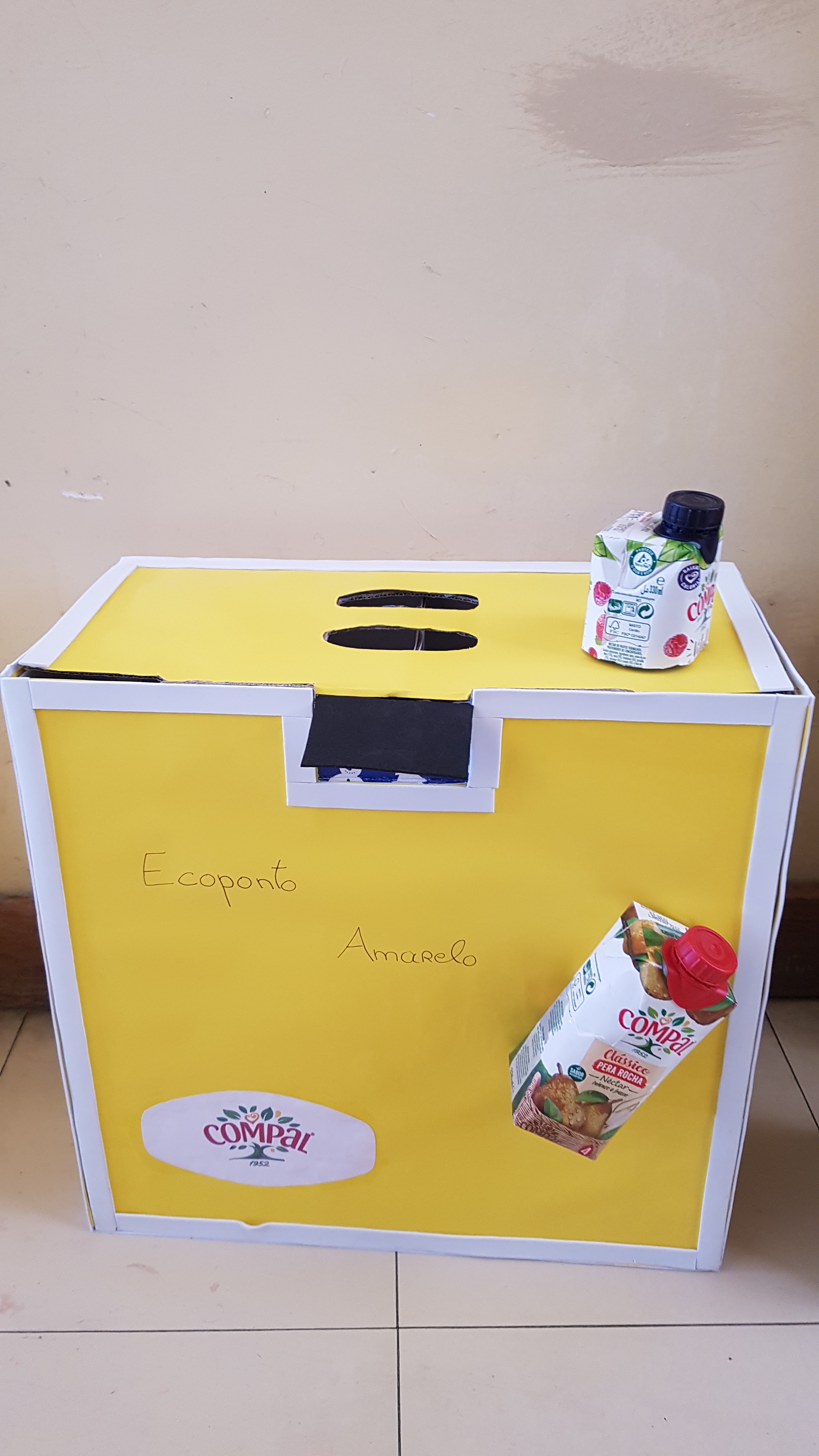 A aluna Ariana Soares, do 8º ano, aceitou o desafio e para construir o seu ecoponto utilizou cartolina amarela, espuma branca, espuma preta, cola branca, jornal, caixa de cartão, caixas de sumos Compal e logotipo da Compal imprimido.