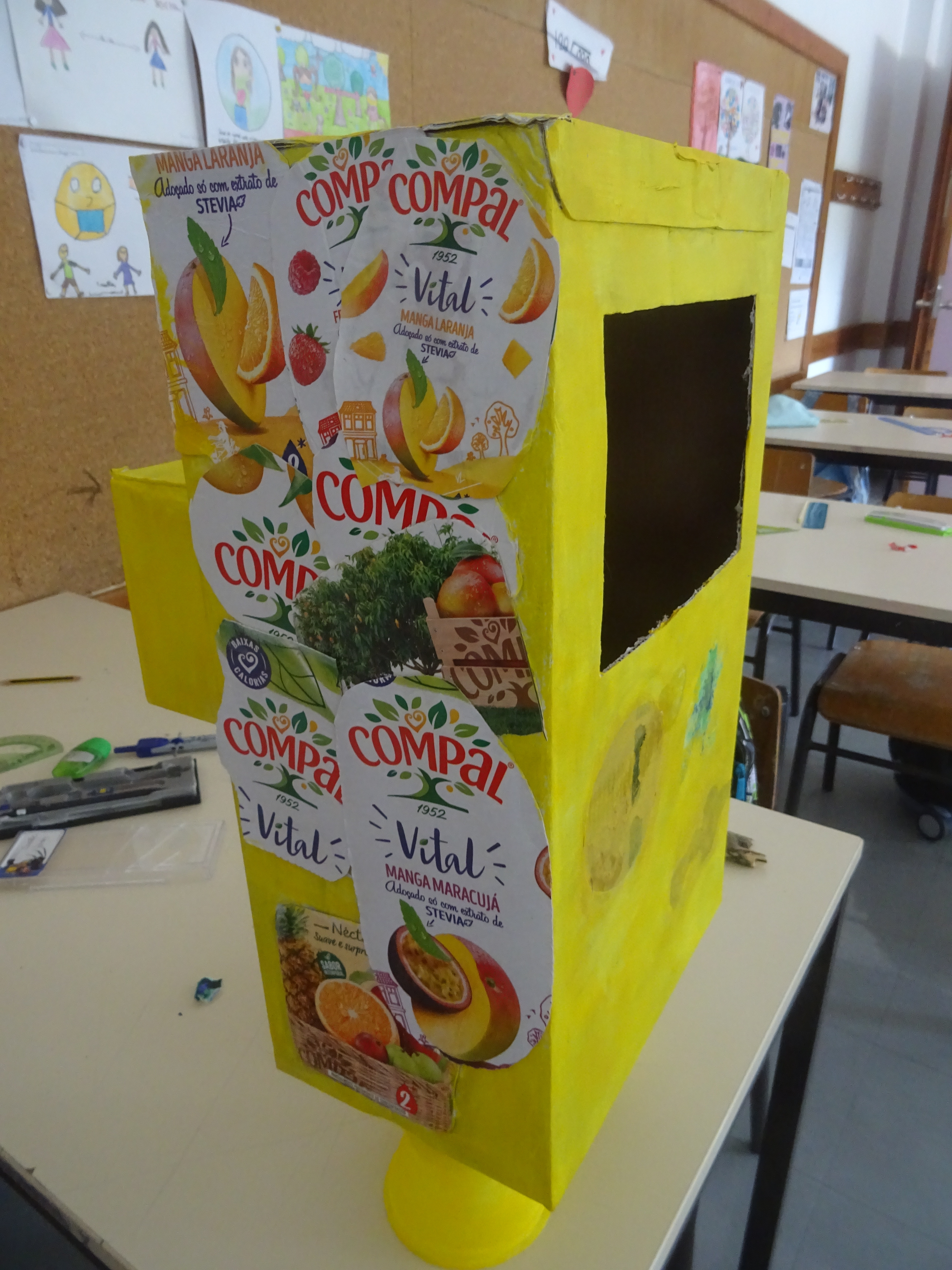 Posteriormente aproveitaram caixas de cartão e executaram os 6 embalões de acordo com os croquis elaborados. Os Ecopontos foram então pintados e decorados com as embalagens de Compal.